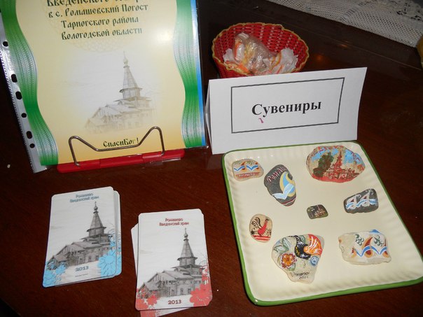 009 ← Предыдущее Следующее → Первые сувениры. Календарики с храмом, который будет. Камушки, расписанные вручную вологодскими архитекторами. Всего раз приезжали в Ромашево… На камушках элементы росписи, которой храм был украшен изнутри.